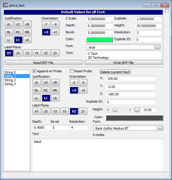 The control panel for place_text is shown above. The panel is in two sections. The first has the default values for all new text strings that you create by probing. The lower section has many of the same parameters, but allows you to edit the values for these parameters for each string whether the string was created by probing or input from an EMT file.